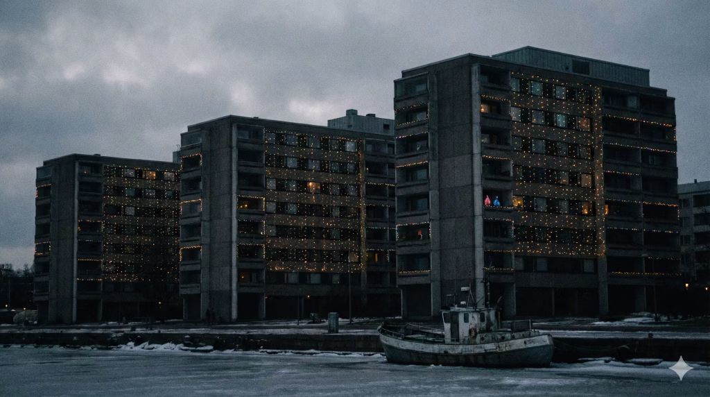 Ehkä todellinen pohjoisen joulu asuukin juuri täällä, missä pimeys on syvintä. Kun massiivinen betonitorni katoaa lumipyryyn ja vain yhdessä ikkunassa palaa valo, siinä on jotain ylevää ja lohdullista. Se on muistutus siitä, että ankeimmankin maiseman keskellä ihminen rakentaa itselleen pesän, ja tekee siitä joulun.