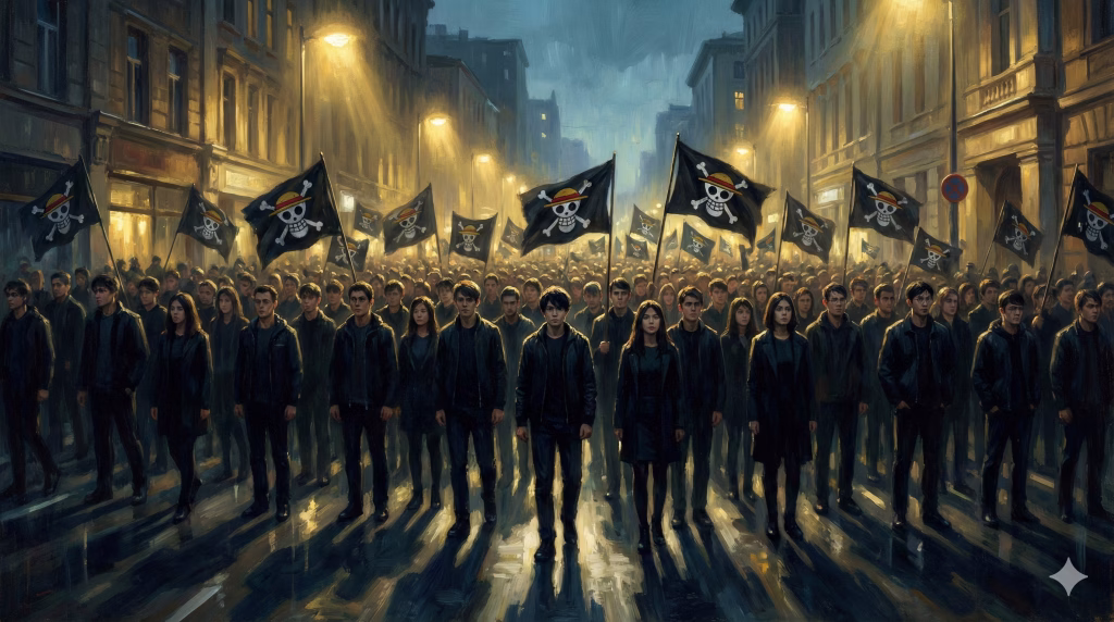 One Piece -symboliikka on muuttanut mielenosoitusten estetiikan synkästä vastarinnasta eräänlaiseksi “vapauden juhlaksi”, jossa kuuluu sarjasta tuttu “Vapautuksen Rummut” -rytmi.