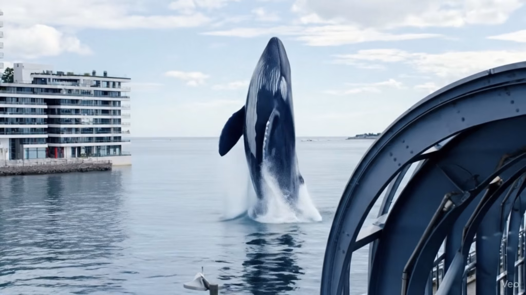 Jättimäinen valas hyppää merestä Kalasatamassa