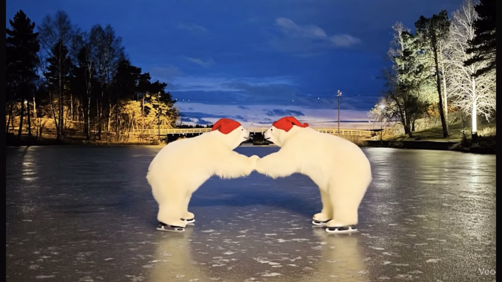Kluuvinlahti Helsingin Kulosaaressa oli tänään 27.11.2025 saanut paperinohuen jääpeitteen. Tämän rakastuneen karhuparin ikuisti pyynnöstämme Google Gemini. Taustakuva on valaistusta myöten aito.